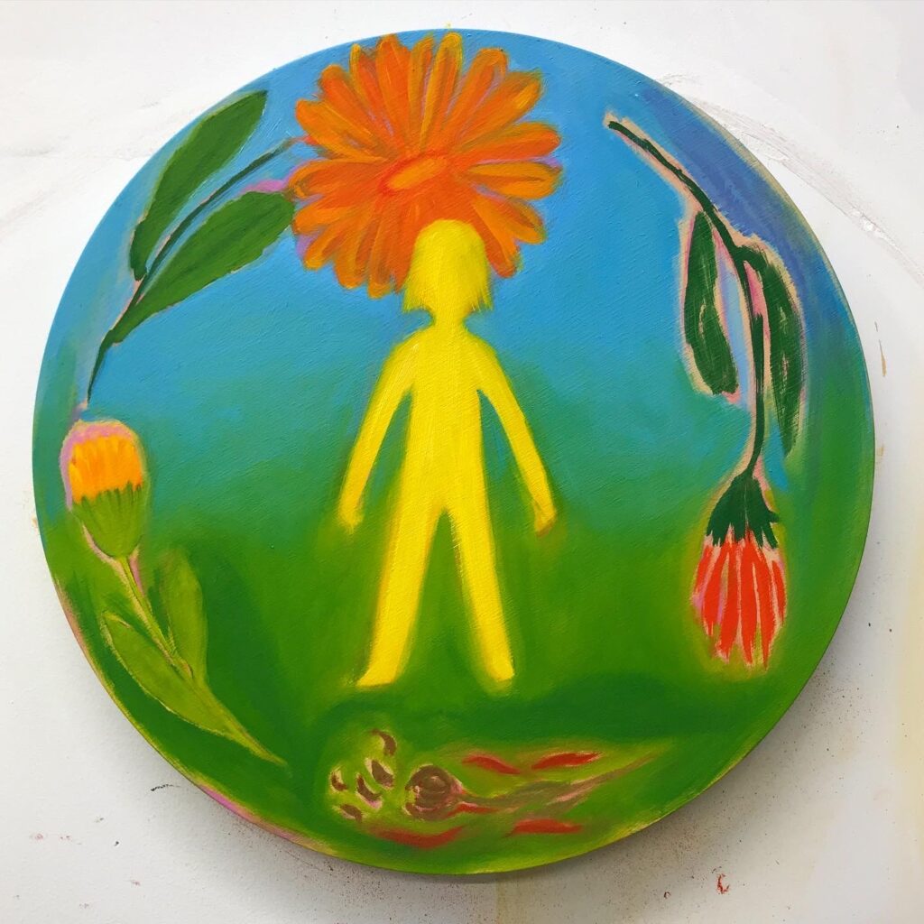 Around the child, I painted calendula flowers. They are flowers with a solar energy, which I associate with childhood. It’s like putting calendula balm on the wounds of childhood.