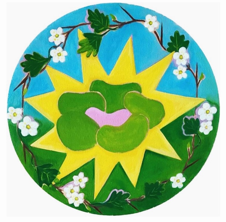 Around us is Hawthorn. I was in Brittany at the time, where many Hawthorns were growing. I spent a lot of time near them. They have those soft delicate flowers, and strong thorns to protect them. Hawthorn is also known as a protector of the Heart.